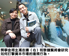 香港城市大學(城大)兩名博士生馮志揚及黎鶴賢獲頒總值最高達240,000澳元(折合約130萬港元)的獎學金,資助未來三年的研究,以打擊資本市場的違規行為,維護市場的持正操作。