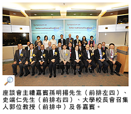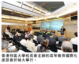 香港特區大學校長會10月31日在香港城市大學(城大)舉行高等教育國際化座談會,藉此提升大學學術及行政人員的國際化意識,並推動香港高等教育國際化及其持續發展。座談會得到大學教育資助委員會支持。教育局局長孫明揚先生及大學教育資助委員會秘書長史端仁先生應邀出席座談會擔任嘉賓。