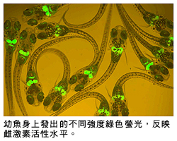 生物及化學系副系主任鄭淑嫻博士領導的研究小組成功培育出一種轉基因鯖鱂魚,能發出不同強度的綠色螢光來反映雌激素活性水平。