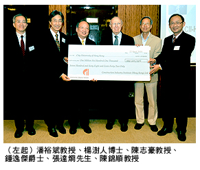 出席支票頒贈儀式的嘉賓包括香港建造業研究學會主席鍾逸傑爵士、發起人兼董事楊澍人博士、執行委員會主席張達烱先生、城大署理學務副校長陳志豪教授、科學及工程學院署理院長潘裕斌教授及建築系系主任陳錦順教授。