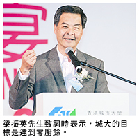 梁振英先生致辭時(shí)說(shuō):「今晚學(xué)生會(huì)舉辦的城大夜宴很有意義,兩千多名學(xué)生和教職員一齊參加,無(wú)不盡歡。減少和處理廚餘是城大社會(huì)責(zé)任的工作重點(diǎn),我希望今天的夜宴可以開(kāi)個(gè)頭。宴會(huì)上,有107席同學(xué)同意將八個(gè)餸減至六個(gè)餸。希望今晚的減餸行動(dòng)可以讓同學(xué)經(jīng)常思考浪費(fèi)食物的問(wèn)題,從源頭上減少?gòu)N餘。」