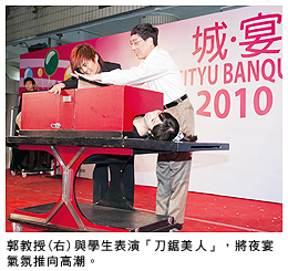 夜宴安排了一項(xiàng)特備節(jié)目,由郭教授上場(chǎng)參與魔術(shù)表演。當(dāng)郭教授與學(xué)生表演「刀鋸美人」時(shí),所有學(xué)生高聲歡呼,把夜宴的氣氛推向最高潮。