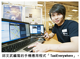 電腦科學(xué)系學(xué)生邱文武編寫的手機(jī)應(yīng)用程式 「TaxiEverywhere」,可將候車人與的士司機(jī)互相配對。乘客只要用裝有該程式的手機(jī)發(fā)出信息,在附近空車行駛的司機(jī)便會(huì)收到,並獲悉其位置,隨即趕到乘客身邊。該程式又可顯示各地區(qū)的士分佈密度、過往接載最多乘客的地點(diǎn)。此外,一名司機(jī)若得知某處有很多候車人,可將此項(xiàng)信息發(fā)給眾多同行,既可減少空車行駛,亦縮短候車人的等候時(shí)間。