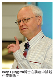 瑞典前駐中國和越南大使B?rje Ljunggren博士2月27日在香港城市大學(城大)演講,論述中國經濟的崛起與美國軸心向亞洲轉移。