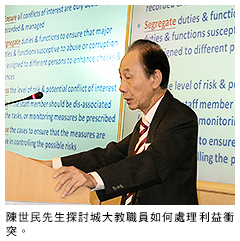 行政總監陳世民先生講話時表示,有必要認識到利益衝突有可能發生。他還說,若不留意相關規定和政策,就有可能出問題。