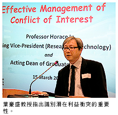 署理副校長(研究及科技)葉豪盛教授提醒主管人員留意利益衝突問題。他指出,城大每年約有2,000個研究項目,部分研究可能持續進行數年,而所有經費大部分來自公帑。因此他認為,必須要求員工嚴格承當責任,以保持公眾對城大的信心。