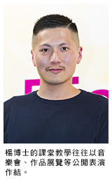 為此目的,他邀請行內的專業人士、實踐藝術家,以及相關公眾人士走進教室,參與審議學生的作品。楊博士為學生習作所打的分數,有很大比重來自應邀參與教學的專業人士,他的課堂教學往往以音樂會、作品展覽等公開表演作結。