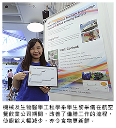另外,機械及生物醫學工程學系學生黎采儀在一所航空餐飲業公司實習期間,應用學科知識,為公司改進雪藏倉庫的佈置以提高生產力,並更改預備飛機餐食物的工序,令其中水果盒的預備時間減少近一半,不僅讓乘客享用更新鮮的食物,而且減少了浪費。她又建議公司考慮將食物的預備及包裝兩道工序合併,既減少存貨,又可加快備膳工作。黎采儀解釋說,「航空公司所服務的乘客人數時常變動,大幅精簡備膳工作流程後,我們預備的飛機餐份量更準確了,而且避免食物過多而造成廚餘?!顾ρ裕麖耐獗砜磥砜赡芏家粯樱慈疹A備包裝的吃起來一定更新鮮。