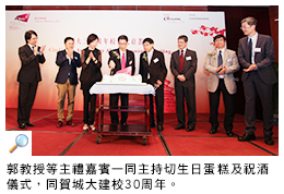 郭教授在晚宴上介紹了城大近期的發展及學術成就,他感謝校友多年來對大學的不懈支持。隨後校長偕同其他嘉賓一同主持切生日蛋糕及祝酒儀式,與大家一同舉杯,慶賀城大建校30周年。其他精彩項目包括:北京航空航天大學學生的中樂表演、城大校友領袖分享、遊戲及抽獎等。剛於同日成立的城大北京校友聯誼會召集人鍾國儀先生發言,為來賓講述該會的使命及對未來的展望,並向母校贈送紀念品。他鼓勵校友們積極參與校友活動。