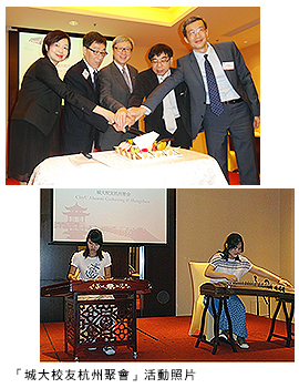 城大的校友網絡發展漸趨成熟,校友聯絡處除了在北京舉辦校友活動,翌日也在杭州舉辦校友活動。郭教授5月19日應邀在浙江大學演講,適逢校友聯絡處前一日即5月18日也在杭州舉行了「城大校友杭州聚會」。宴會開始前,浙江大學學生以古箏及揚琴奏出「瑤族舞曲」,為活動揭開序幕。郭教授在席間為來賓介紹大學近期的發展及佳績,並與大家一同慶賀大學建校30周年。王教授鼓勵校友回到校園參加2014年11月30日由校友聯絡處舉辦的「樂聚城大校友日」,同日也是城大30周年的閉幕典禮。出席晚宴的大學代表還有副校長(學生事務)葉豪盛教授、協理副校長(校友聯絡)陳燕玲女士、協理副校長(內地及對外事務)程星博士等。