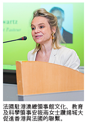 法國駐港澳總領事館的文化、教育及科學領事Anne Denis-Blanchardon女士致辭,她讚揚城大邀請世界一流學者來香港分享研究成果,增強了香港與法國的聯繫。
