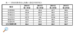 將兩岸四地的2014年第四季度消費(fèi)者信心互相比較,可見中國內(nèi)地的信心最高(104.0分),其次是澳門(87.4分),隨後是臺(tái)灣(86.2分),而香港的信心最低(84.7分)(詳見圖一)。