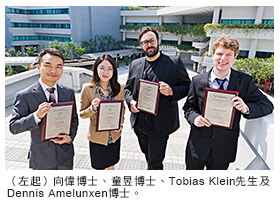 獲獎者分別是數學系的助理教授Dennis Amelunxen博士和向偉博士、創意媒體學院助理教授Tobias Klein先生,以及資訊系統學系助理教授童昱博士。